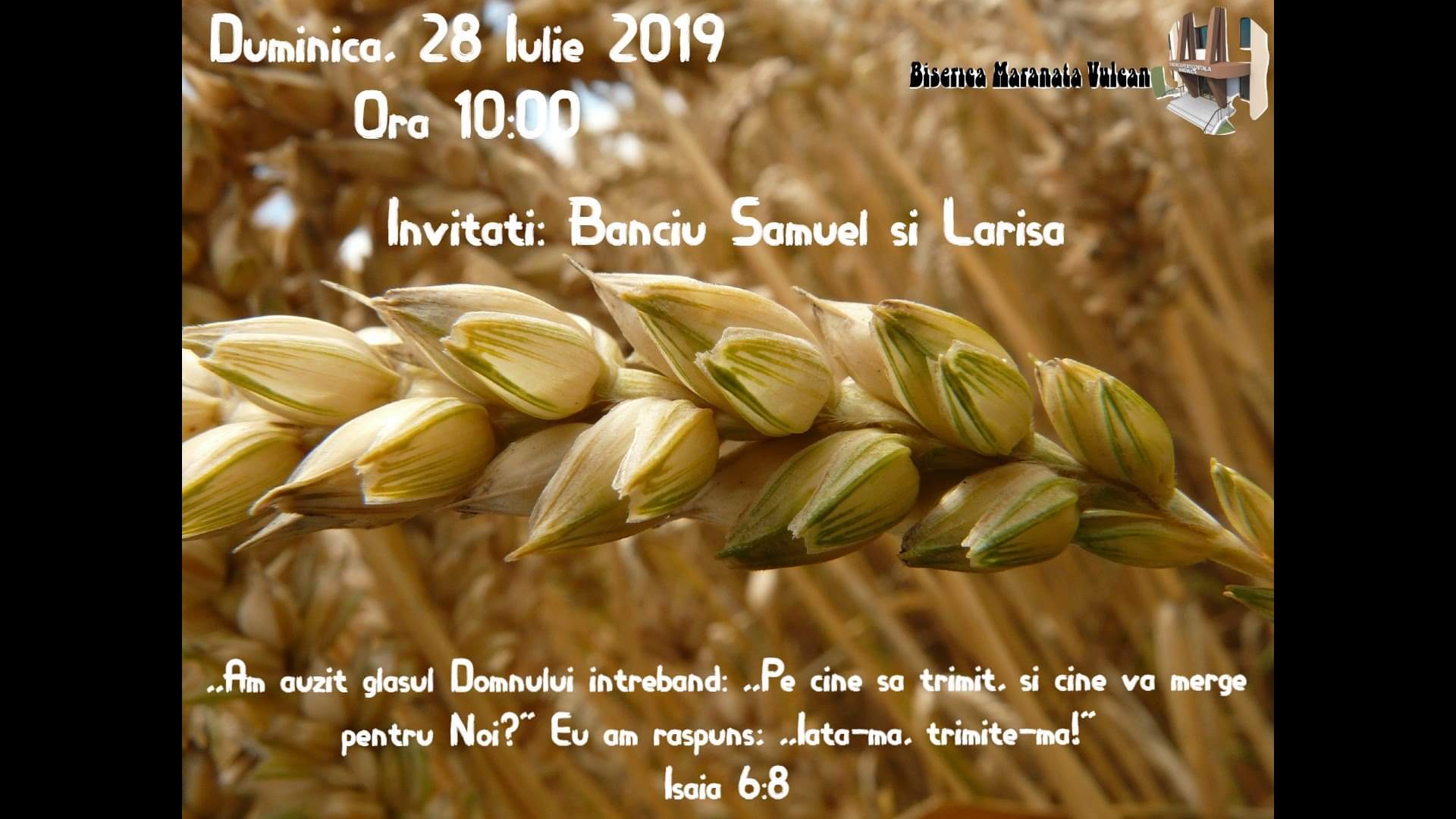 Va invitam duminica 28 iulie 2019 de la orele 10:00, la un Serviciu Divin de Evanghelizare in Biserica Maranata Vulcan.