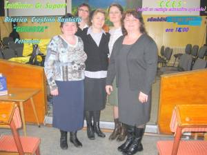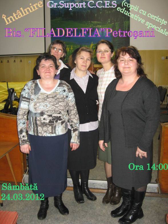 Sâmbătă 13 oct. 2012 ,în Bis.Creştină Baptistă „Golgota” din municipiul Petroşani a avut loc o întâlnire cu Gr. Suport C.C.E.S. (copii cu cerinţe educationale speciale)şi nu numai ci a persoanelor cu dizabilităţi ,de orice vârstă, cu persoanele aflate în această situaţie:copii,tineri,vârstnici,femei şi bărbaţi,întâlnire organizată pe întreagă Valea Jiului. Câteva cuv. despre activitatea acestui grup:este un grup de surori din Bisericile Creştine din Valea Jiului care se ocupă cu ajutorul D-lui şi prin bunăvoinţa celor dornici să ajute la această lucrare;de toate persoanele aflate în situaţii puţin îngrijorătoare din punct de vedere al sănătăţii lor din cauza dizabilităţii.Lucrarea cuprinde pe toţi acei care au o boală acută,o dizabilitate,care prezintă o problemă atât pt. ei cât şi pt cei din jur şi care au dorinţa să se înscrie în acest grup.Această lucrare nu este sponsorizată de nimeni ci toate activităţile s-au făcut cu donaţii din partea celor care simt cu cei ce suferă ,şi a celor care vor să împlinească cuv.(daţi şi vi se va da). Pt. orice informaţie referitoare la acest grup ,neclarităţi cât şi pt. cei ce au inima largă şi ştiu ce este suferinţa şi vor să facă o donaţie cât de mică (din picături de ploaie se face râul şi oceanul),persoana de contact este sora Eliza Darie din Petroşani :tel.0746145986 sau adresa Email elizadarie@yahoo.com